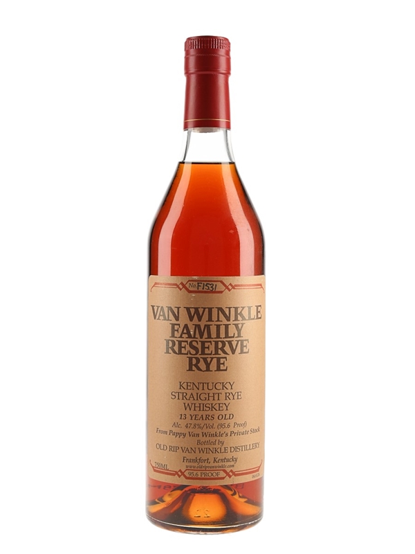 A bottle of Van Winkle Family Reserve Rye 13 Year Old Kentucky Straight Rye Whiskey, bottled by Old Rip Van Winkle Distillery, Frankfort, Kentucky, at 47.8% ABV.