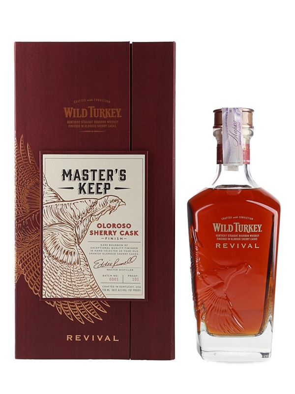 A bottle of Wild Turkey Master's Keep Revival Kentucky Straight Bourbon Whiskey, made with bourbon aged for 12 to 15 years and finished in 20 year old oloroso sherry casks.