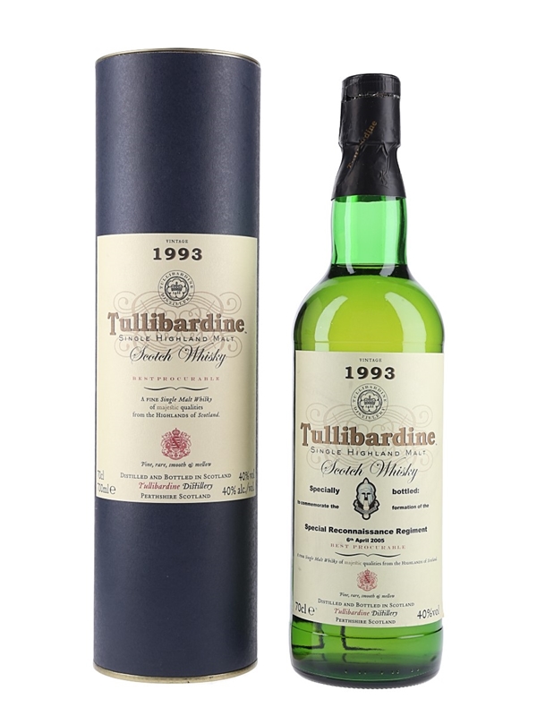 A bottle of Tullibardine 1993 Single Highland Malt Scotch Whisky. This was distilled in 1993 and specially bottled to commemorate the formation of the Special Reconnaissance Regiment on 6th April 2005.