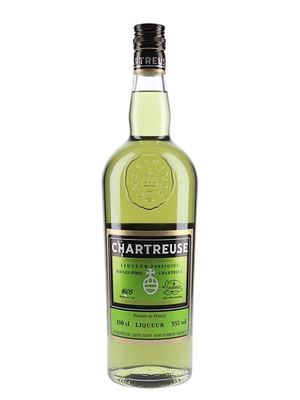 A litre bottle of green Chartreuse liqueur, produced in France. The bottling code indicates this was bottled in 2020.