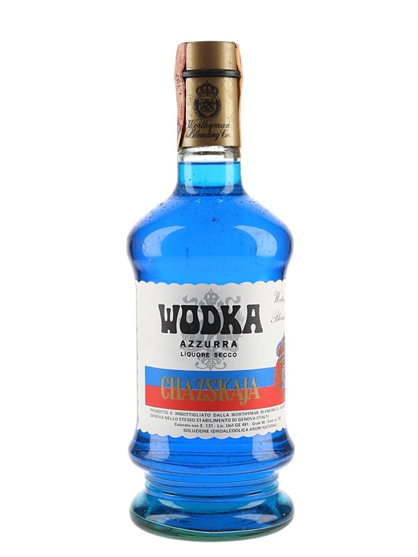 A bottle of Chazskaja Azzurra Vodka from Scotland. We estimate this was bottled in the 1970s.