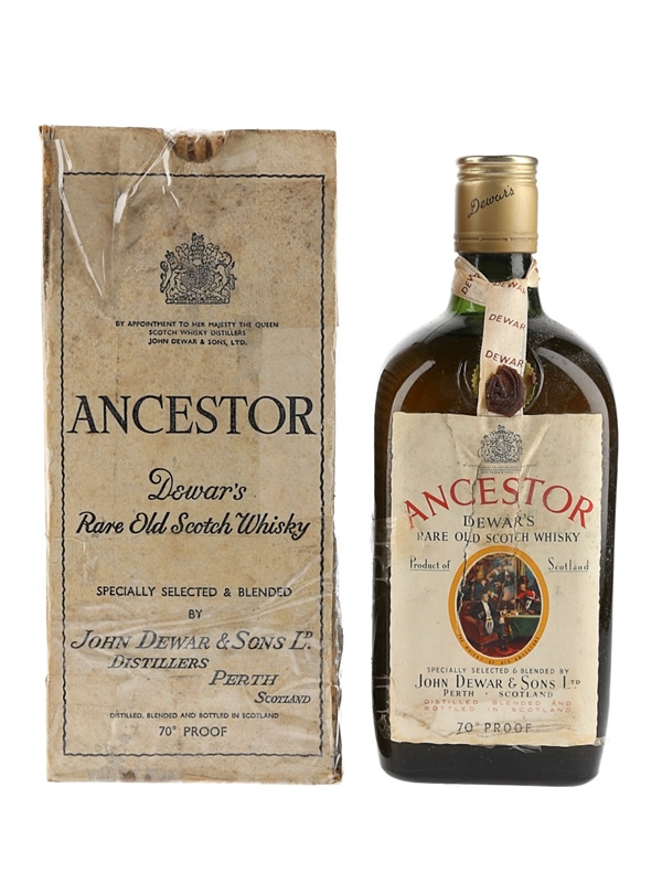 A bottle of Dewar's Ancestor Rare Old Scotch Whisky, specially selected and blended by John Dewar & Sons Ltd. We estimate this was bottled in the 1960s.