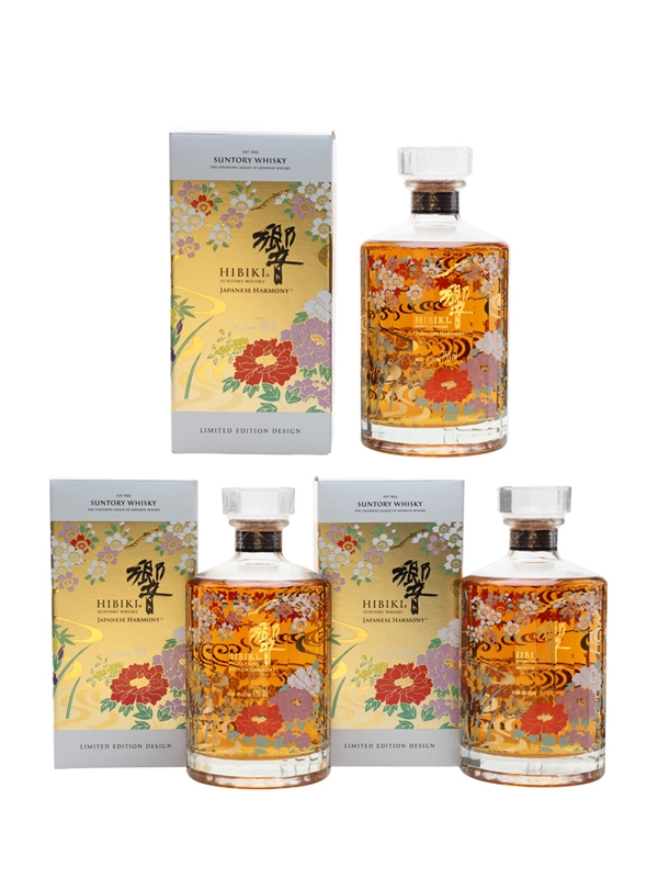 This lot contains three bottles of Hibiki Japanese Harmony Suntory Whisky produced in Japan. This is the 2021 edition of Suntory's annual release named Ryusui-Hyakka, meaning One-Hundred Flowers and Flowing Water.