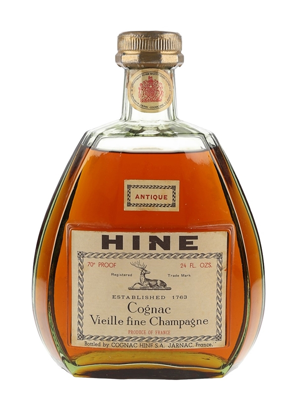 A bottle of Hine Antique Vieille Fine Champagne Cognac. We estimate this was bottled in the 1960s.