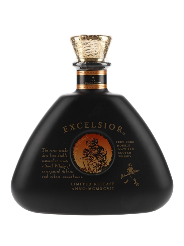 A bottle of Johnnie Walker Excelsior Very Rare Double Matured Scotch Whisky. This was produced from whiskies distilled in 1947 and bottled in 1997 after maturation in port casks. Presented in an opaque triangular bottle.