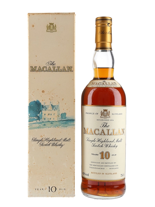A bottle of The Macallan 10 Year Old Single Highland Malt Scotch Whisky, matured in sherry wood. We estimate this was bottled in the 1980s.