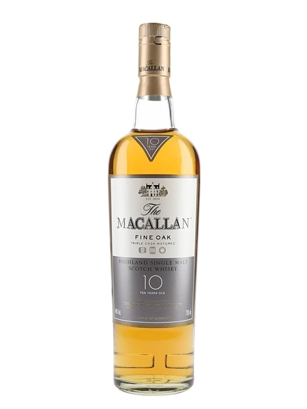 A bottle of The Macallan 10 Year Old Triple Cask Matured Highland Single Malt Scotch Whisky from the Fine Oak range. This was aged for 10 years in a combination of bourbon and sherry casks.