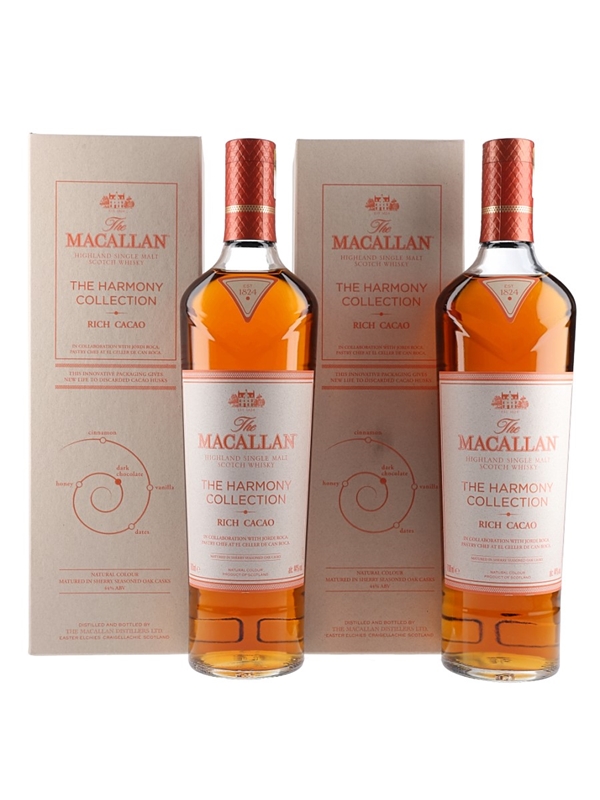 This lot contains two bottles of The Macallan Rich Cacao Highland Single Malt Scotch Whisky from The Harmony Collection, bottled at 44% ABV. This is inspired by the chocolate creations of Spanish chef Jordi Roca, pastry chef at El Celler de Can Roca. The restaurant was twice voted best restaurant in the world.