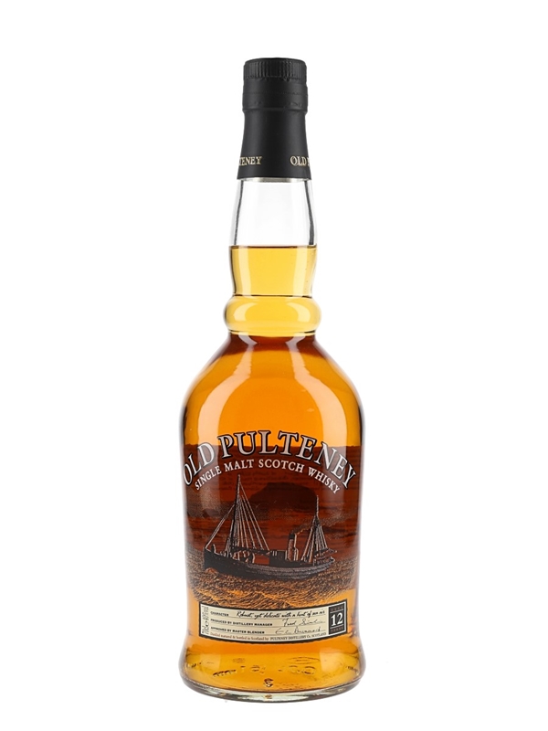 An old presentation bottle of Old Pulteney 12 Year Old Single Malt Scotch Whisky with a screen printed label. This was bottled prior to 2013, when Wolfburn took the title of Scotland's most northerly mainland distillery from Old Pulteney.
