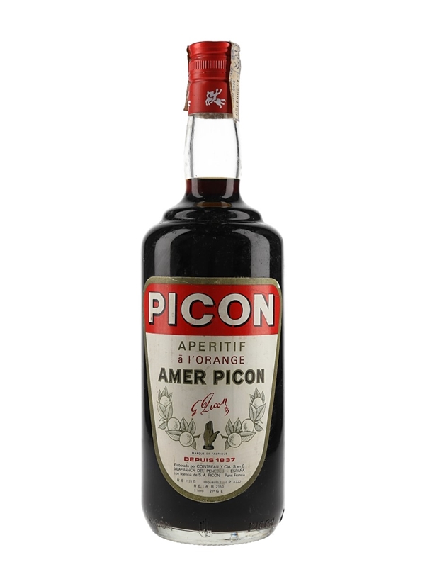 A litre bottle of Picon Aperitif a l'Orange, a bitter liqueur produced in Villafranca Del Penedes, Spain by Cointreau and flavoured with orange, gentian, and cinchona. We estimate this was bottled in the 1970s.