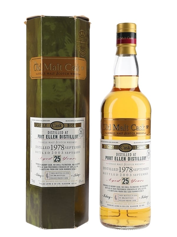 A bottle of Port Ellen Single Malt Scotch Whisky. This was distilled in 1978, matured for 25 years in a single cask and bottled by Douglas Laing as part of The Old Malt Cask range in September 2003.