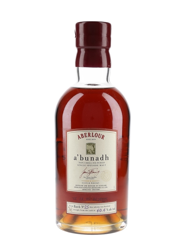 A bottle of Aberlour A'bunadh Batch 25 Single Speyside Malt Scotch Whisky, matured in Spanish oloroso sherry butts and bottled at 60.4% ABV. The bottling code indicates this was bottled in 2008.