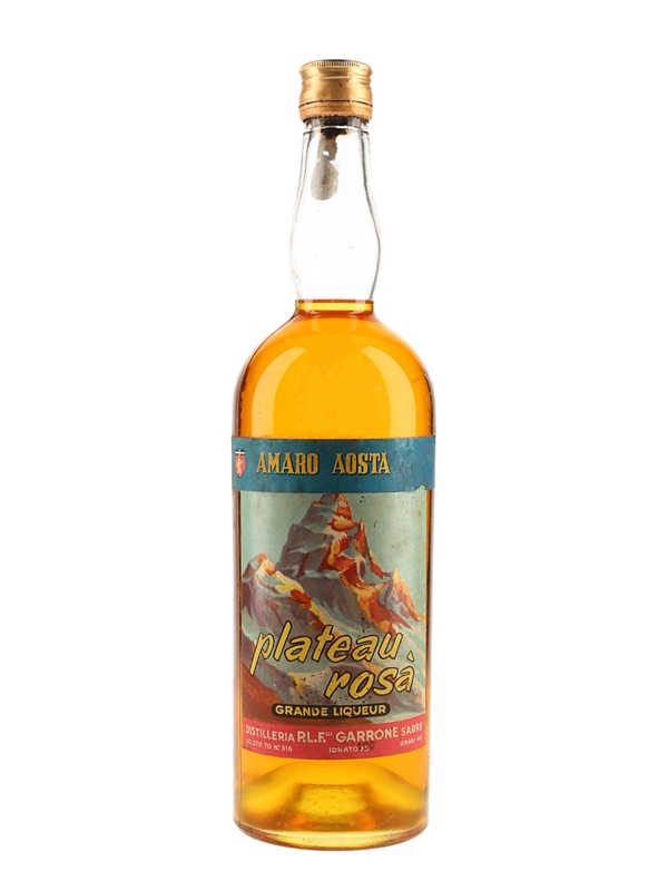 A liter bottle of Amaro Aosta Plateau Rosa liqueur from Italy. We estimate this was bottled in the 1950s.