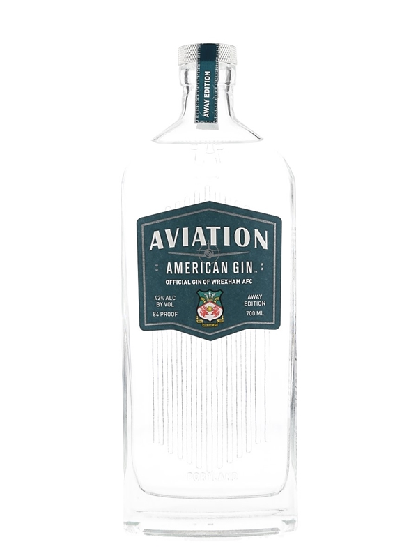 A bottle of Aviation American Gin Official Gin of Wrexham AFC Away edition, distilled from grain.