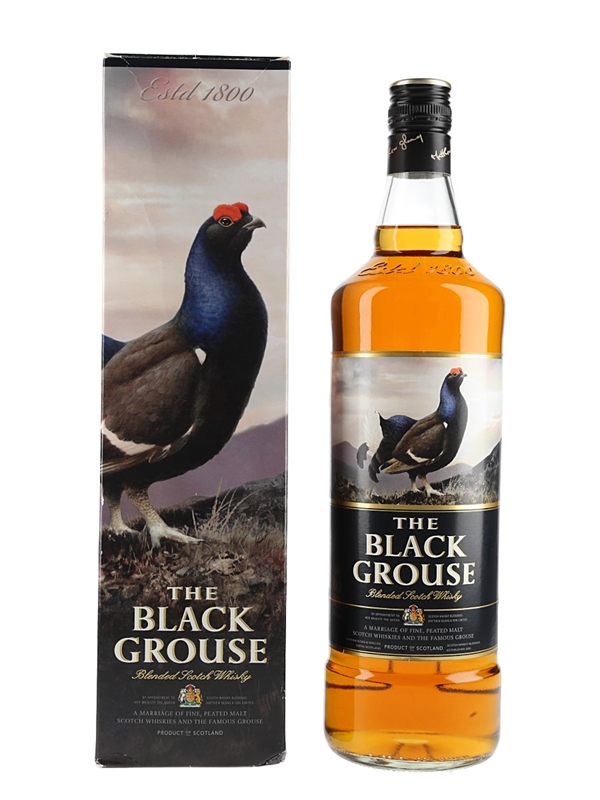 A litre bottle of The Black Grouse Blended Scotch Whisky, a blend of peated malt and The Famous Grouse.