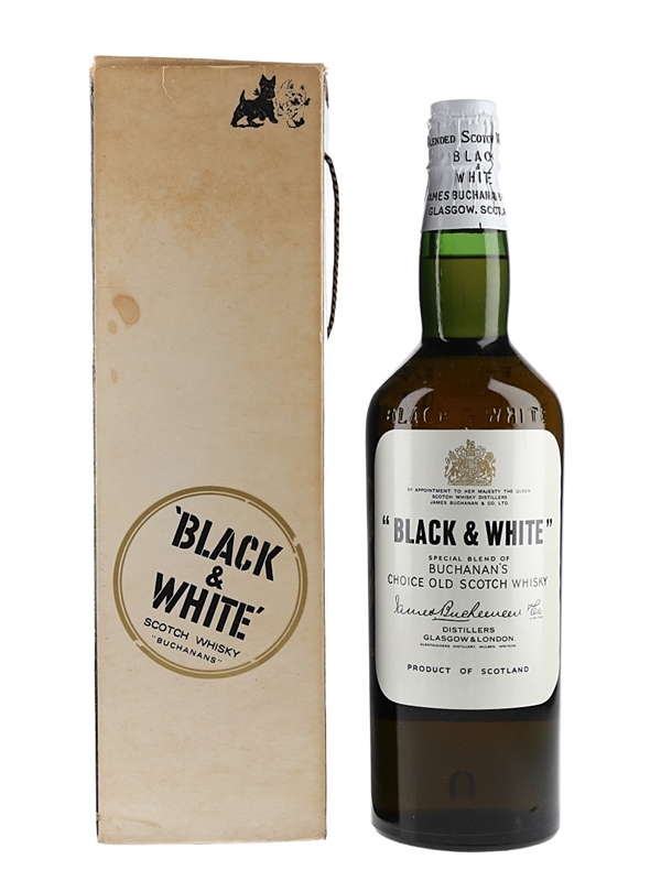 A bottle of Black & White Special Blend Of Buchanan's Choice Old Scotch Whisky produced by James Buchanan & Co. and sealed with a spring cap closure. We estimate this was bottled in the 1960s.