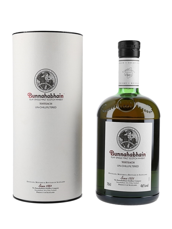 A bottle of Bunnahabhain Toiteach single malt Scotch whisky. Toiteach is Gaelic for 'smoky'.
