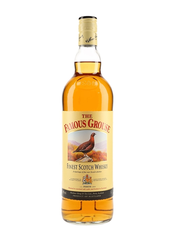 A litre bottle of The Famous Grouse Finest Scotch Whisky, produced by Matthew Gloag & Son Ltd.