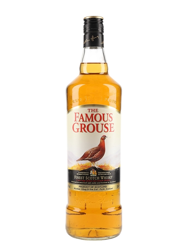 A litre bottle of The Famous Grouse Blended Scotch Whisky, produced by Matthew Gloag & Son Ltd.