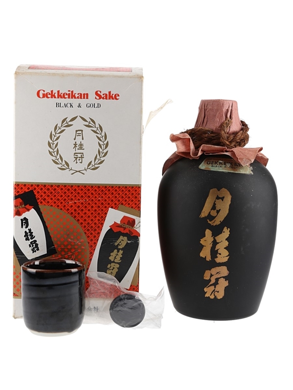 A 72cl bottle of Gekkeikan Black & Gold, the Sake of the Samurai, presented in a ceramic Tokkuri flask with one small cup.