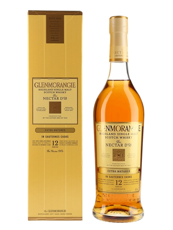 A bottle of Glenmorangie 12 Year Old Nectar d'Or. This was matured first in bourbon casks, before transferring to Sauternes wine barriques for extra aging.
