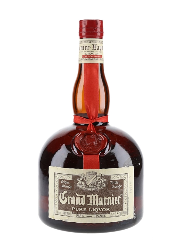 A litre bottle of Grand Marnier Cordon Rouge liqueur produced in France. We estimate this was bottled in the 1970s to 1980s.