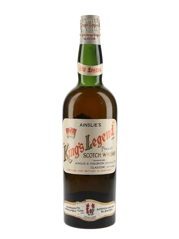 A bottle of Ainslie's King's Legend Old Special Finest Scotch Whisky, produced and bottled by Ainslie & Heilbron Ltd. and sealed with spring cap closure. We estimate this was bottled in the 1950s to 1960s.