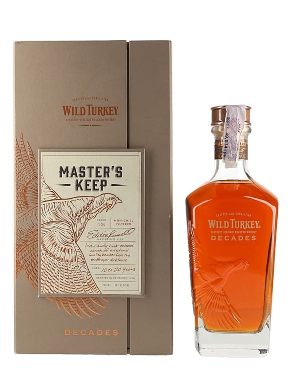 A bottle of Wild Turkey Master's Keep Decades Kentucky Straight Bourbon Whiskey, hand-selected barrels aged between 10 to 20 Years, picked from the McBrayer Rickhous by Master Distiller Eddie Russell. Bottled as part of the Master's Keep series, bottled from batch number 1.