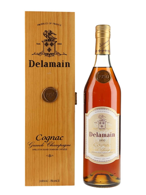 A bottle of Delamain 1950 Grande Champagne Cognac produced in Jarnac, France, by Delamain & Co.