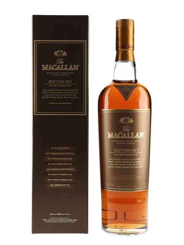 A limited edition bottle of The Macallan Edition No.1 Highland Single Malt Scotch Whisky. This was made from a combination of eight types of American and European oak matured whiskies, bottled at 48% ABV.