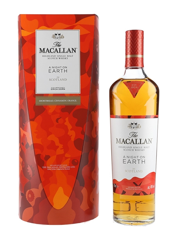 A limited edition bottle of The Macallan A Night On Earth in Scotland, celebrating the joy of New Year's Eve, known in Scotland as Hogmanay. This was aged in European and American sherry seasoned oak casks and ex-bourbon American oak casks. The packaging was designed by Japanese-French illustrator Erica Dorn.