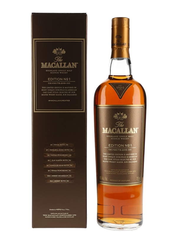 A limited edition bottle of The Macallan Edition No.1 Highland Single Malt Scotch Whisky. This was made from a combination of eight types of American and European oak matured whiskies, bottled at 48% ABV.