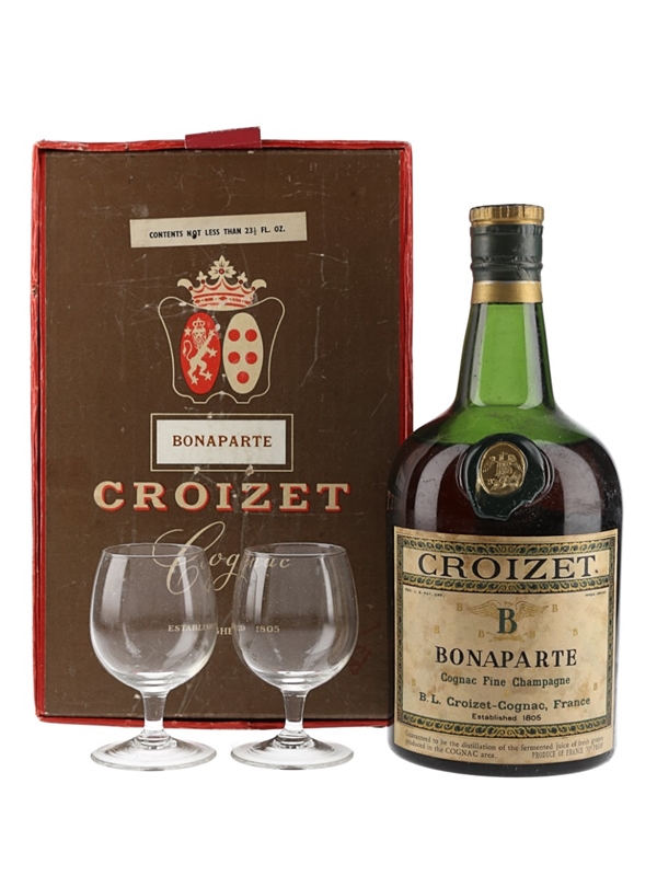 A bottle of 1906 Croizet Bonaparte Cognac Fine Champagne presented in a box with two small snifter glasses.