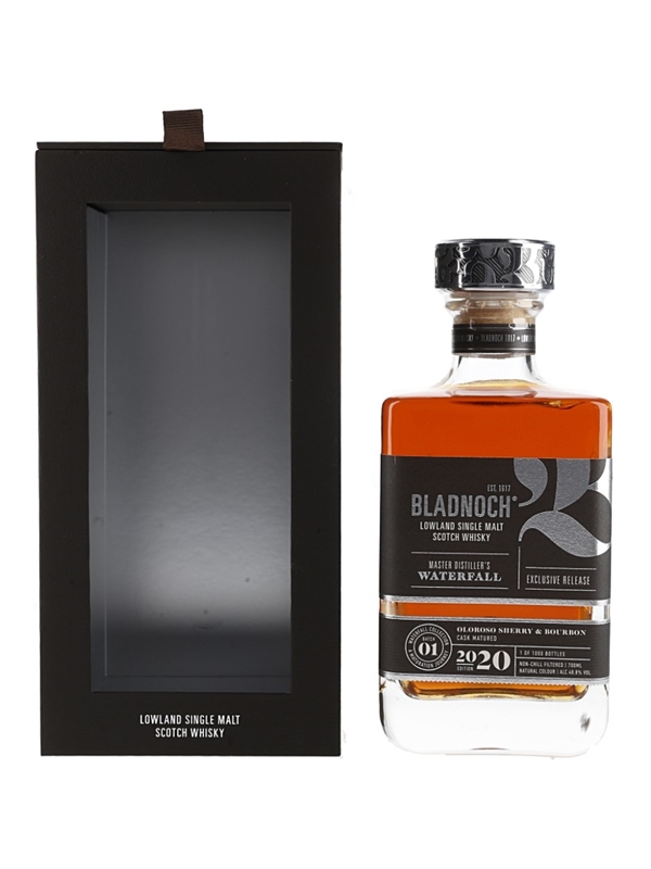 A bottle of Bladnoch Lowland Single Malt Scotch Whisky. This was matured in oloroso sherry and bourbon casks and bottled as part of the Master Distiller's Waterfall Collection.