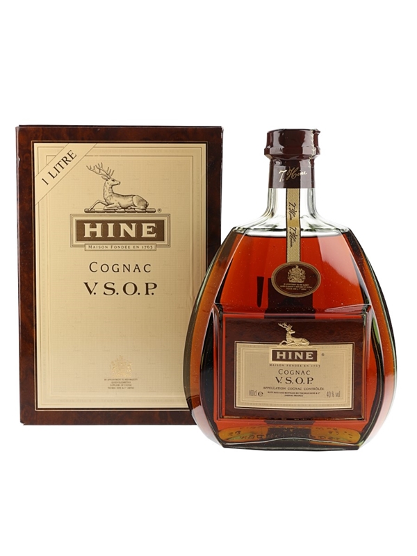 A litre bottle of Hine VSOP Vieille Fine Champagne Cognac. We estimate this was bottled in the 1980s.