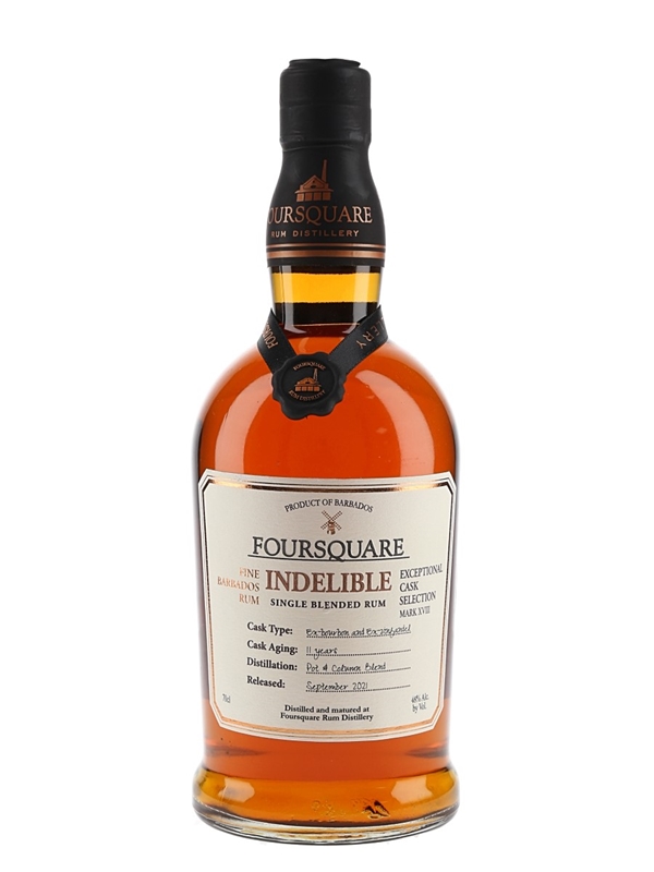 A bottle of Foursquare Indelible 11 Year Old Fine Barbados Single Blended Rum. This was matured in a combination of ex-bourbon and ex-Zinfandel casks for 11 years, bottled at 48% ABV and released in September 2021 for Exceptional Cask Selection Mark XVII.