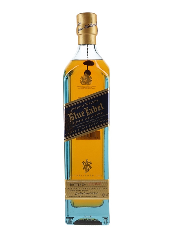 A bottle of Johnnie Walker Blue Label Blended Scotch Whisky produced by John Walker & Sons Limited.