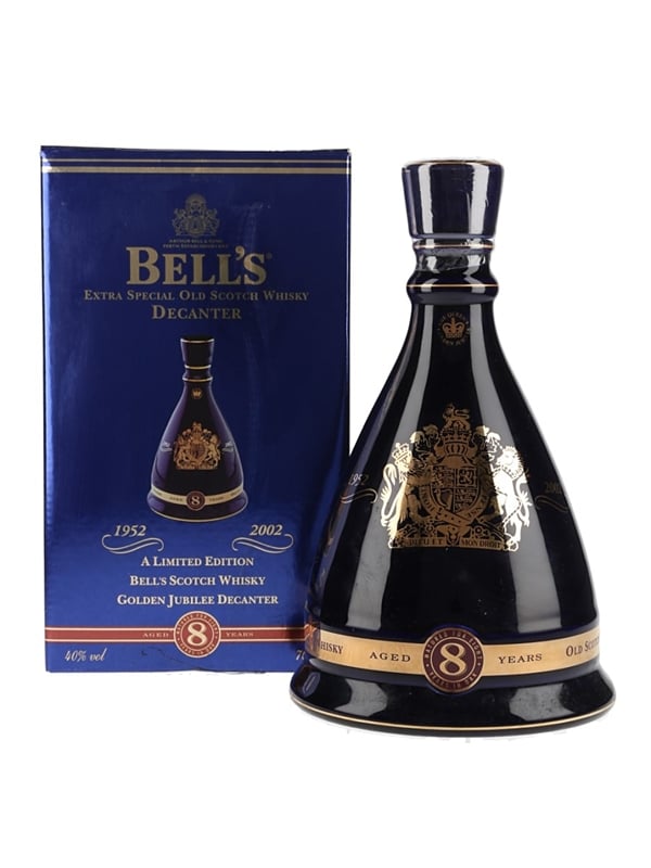 A blue ceramic decanter from Wade containing Bell's 8 Year Old blended Scotch whisky, which was released to celebrate the golden jubilee of Queen Elizabeth II in 2002.
