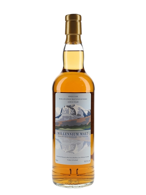 A private cask bottling of Ben Nevis 21 Year Old Millennium Malt. This was distilled in November 1999, matured in a single bourbon hogshead and bottled at 52.3% ABV by Whiskybroker Limited.