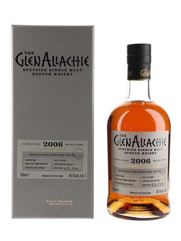 A bottle of The Glenallachie 15 Year Old Single Cask Speyside Single Malt Scotch Whisky. This was distilled on 19 April 2006, matured for 15 years in a single tawny port pipe cask and bottled in August 2021 at a cask strength of 60.7% ABV specially for the UK.