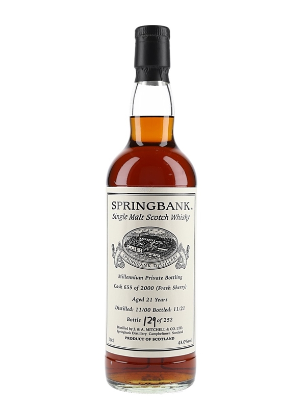 A private cask bottling of Springbank 21 Year Old Single Malt Scotch Whisky. This was distilled in 2000, matured in fresh sherry cask number 655 of 2000 and bottled in 2021 at 43% ABV. This is bottle number 129 of 252.