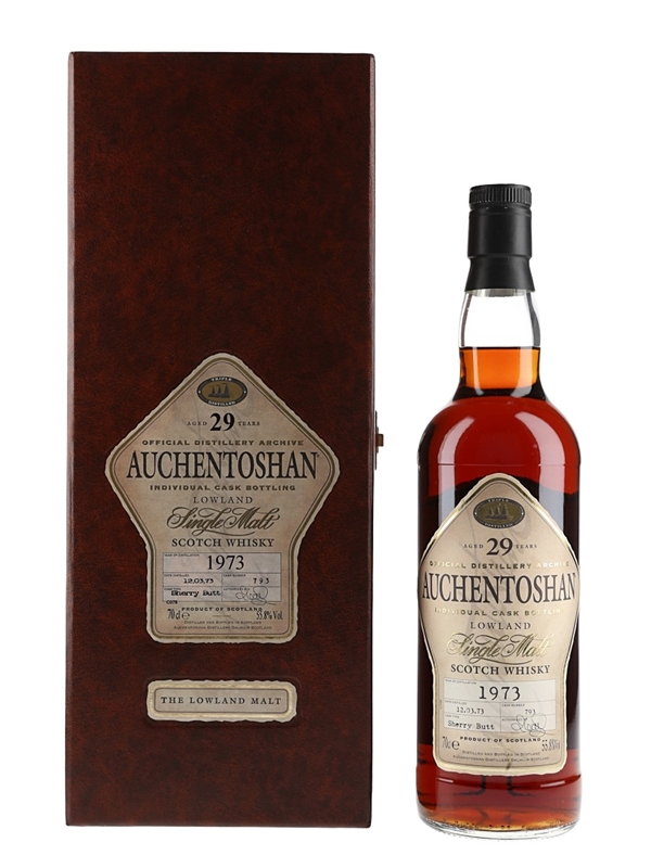 A bottle of Auchentoshan 29 Year Old Individual Cask Bottling Lowland Single Malt Scotch Whisky. This was distilled on 12 March 1973, matured for 29 years in a single sherry butt and bottled at a cask strength of 55.8% ABV.