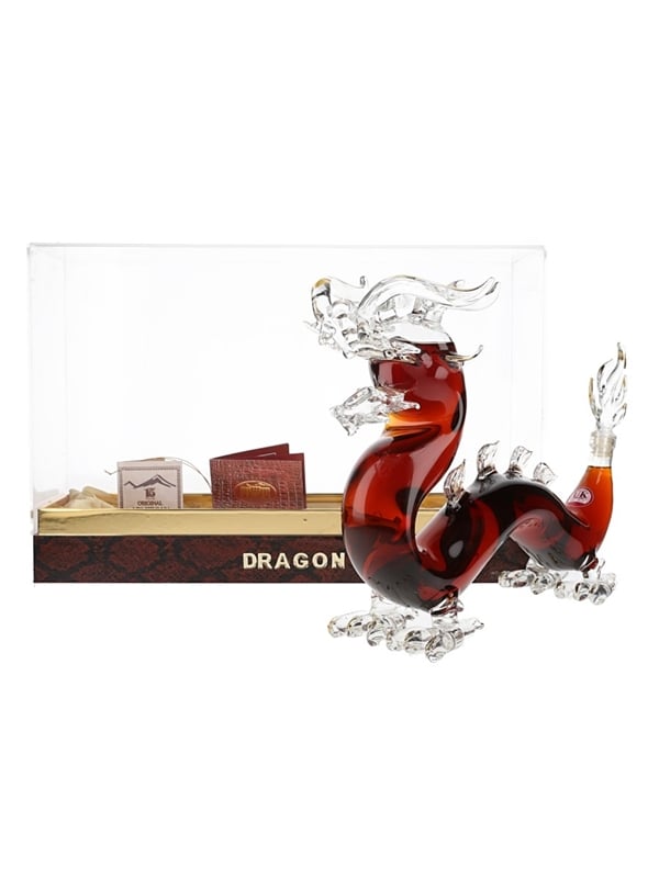 A decanter of Armenian 15 Year Old Brandy from Proshyan Brandy Factory, displayed in a Dragon shaped glass decanter.