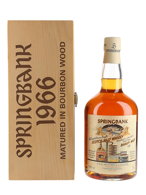 A bottle of Springbank 1966 Local Barley. This whisky was made with ingredients sourced within eight miles of the distillery. It was distilled in February 1966, then matured in a Bourbon cask before bottling in April 1998.