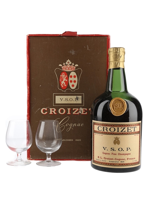 A bottle of Croizet VSOP Cognac in a presentation box with two small brandy balloons. We estimate this was bottled in the 1960s to 1970s.