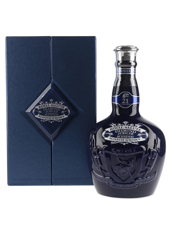 A bottle of Royal Salute 21 Year Old Limited Edition Blended Scotch Whisky, produced by Chivas Brothers Limited and presented in a blue porcelain flagon for the Diamond Jubilee in 2012, celebrating the 60th anniversary of Her Majesty Queen Elizabeth II. The bottling code indicates this was bottled on 19 March 2012.