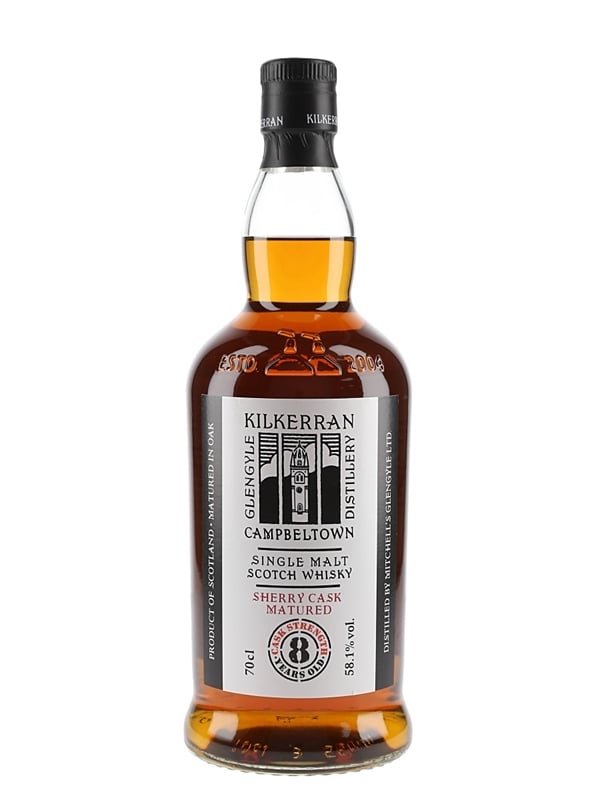 A bottle of Kilkerran 8 Year Old Cask Strength Sherry Cask Matured Campbeltown Single Malt Scotch Whisky, distilled by Mitchell's Glengyle Ltd. and bottled at 58.1% ABV. The bottling code indicates this was bottled in 2022.