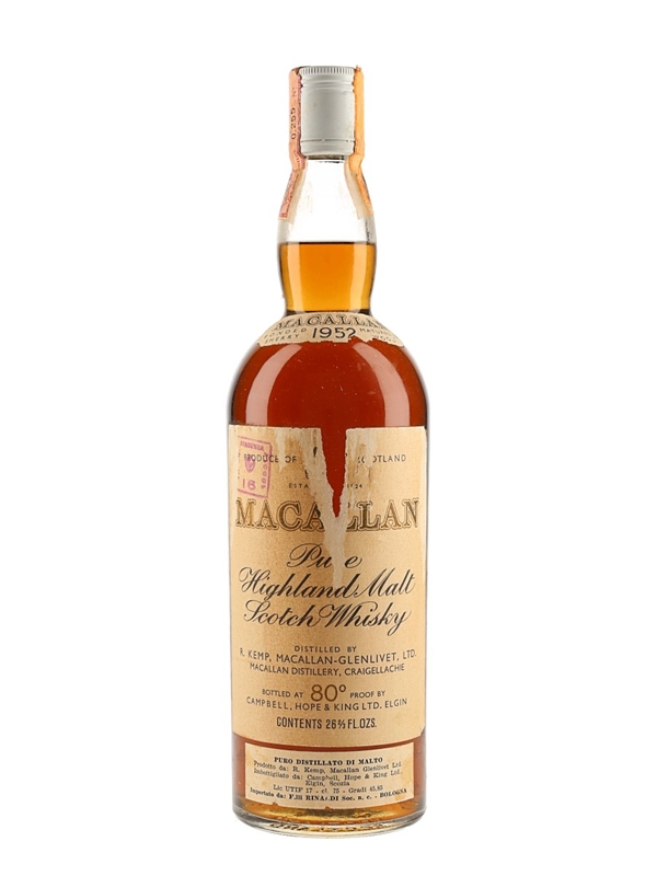 A bottle of The Macallan 1952 Pure Highland Malt Scotch Whisky, bottled by Campbell, Hope and King, we estimate in the late 1960s. This was imported to Italy by Rinaldi.