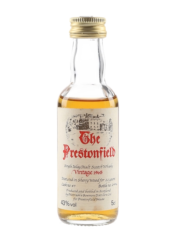 A miniature bottle of The Prestonfield 1965 Single Malt Islay Scotch Whisky bottled by Morrison's Bowmore Distillers Ltd. for Prestonfield House, a five star boutique hotel in Edinburgh.