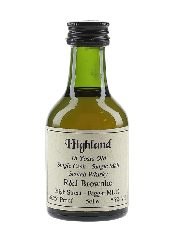 A miniature bottle of 18 Year Old Single Cask Single Malt Scotch Whisky, distilled at an undisclosed Highland distillery and bottled at 55% ABV by R & J Brownlie.